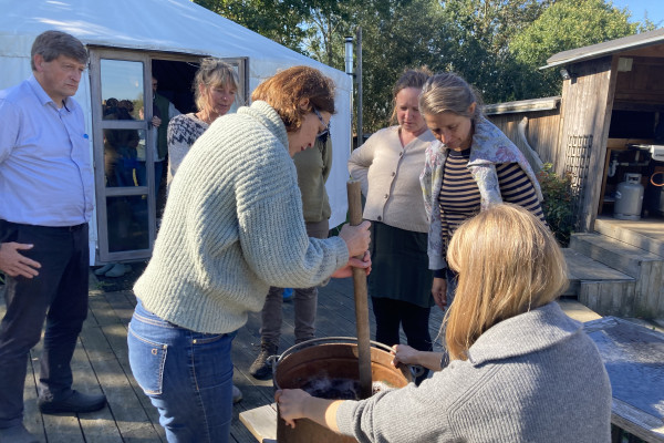 De volgende dag duiken we dieper in de praktijk. In alle eerlijkheid: het is de eerste keer dat ik hoor over ‘preparaten’. Toch sta ik even later in een grote ton water te roeren tot de draaikolk de bodem raakt. Dan strooien we het heermoespreparaat met borstels uit over het land. Het ruikt naar aarde en regen. We nemen de tijd om samen te kijken, te voelen, te zwijgen.